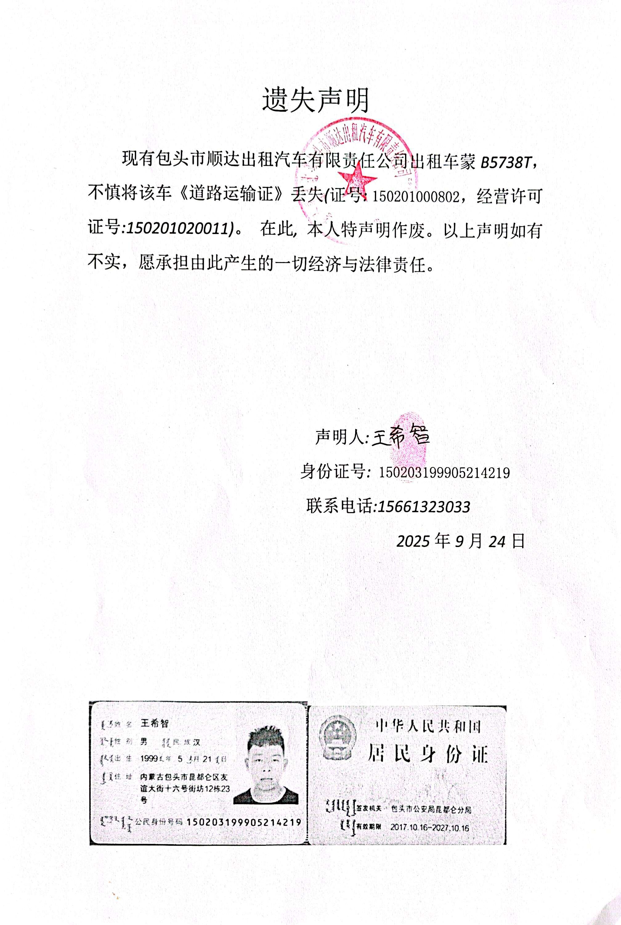 遗失声明(蒙B5738T道路运输证丢失,声明作废)