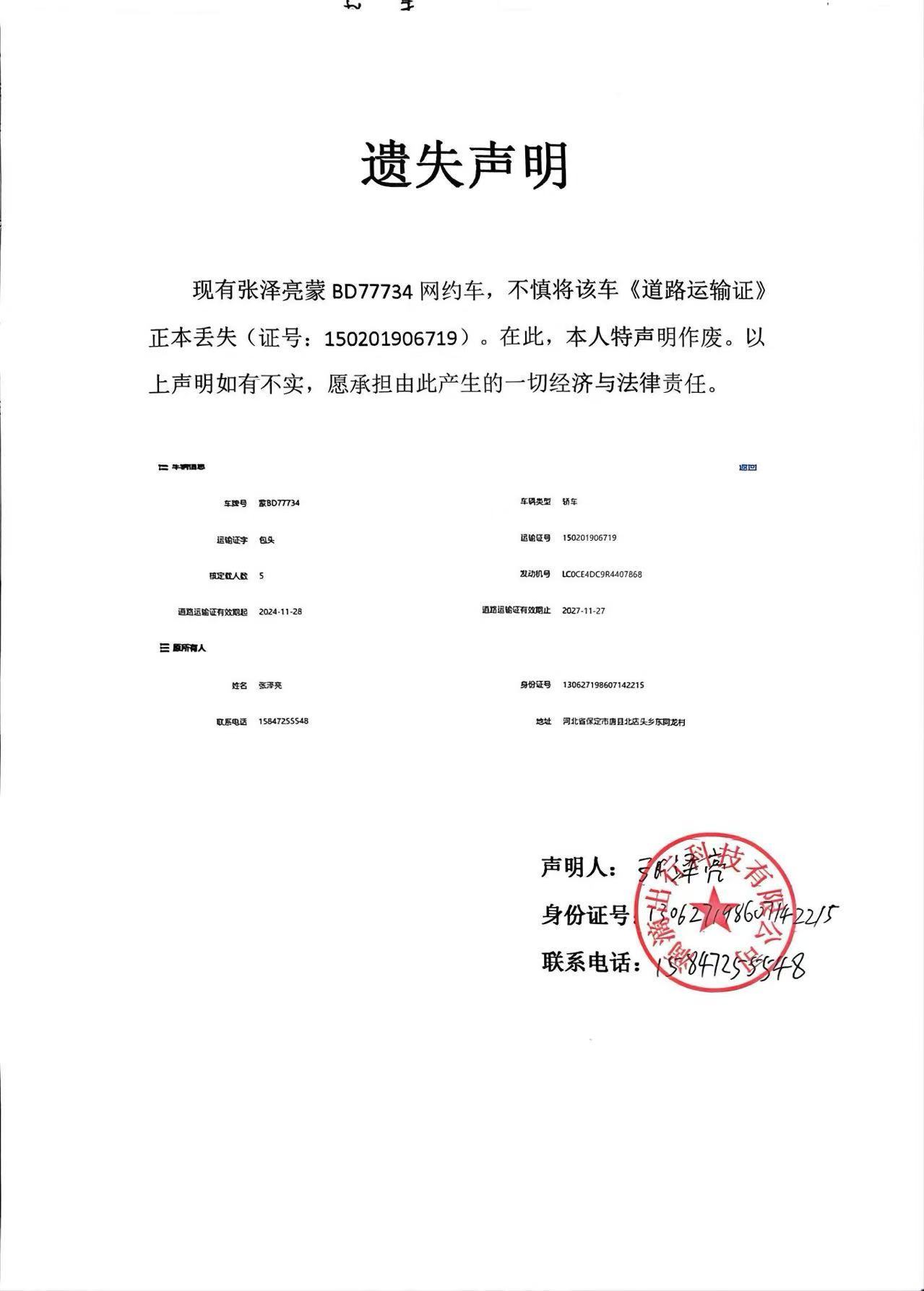 遗失声明(蒙BD77734道路运输证丢失,声明作废)
