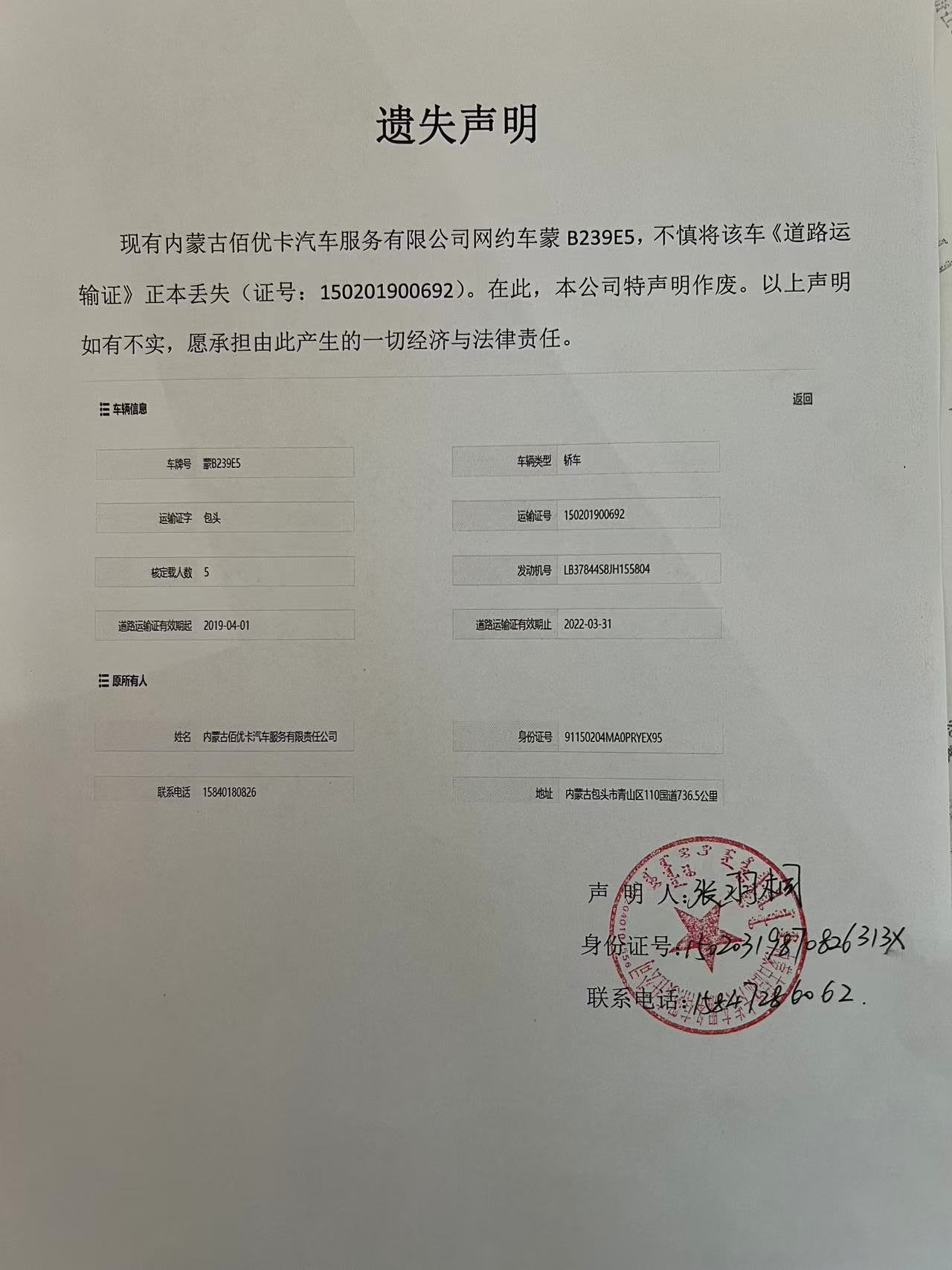 遗失声明(蒙B239E5道路运输证丢失,声明作废)