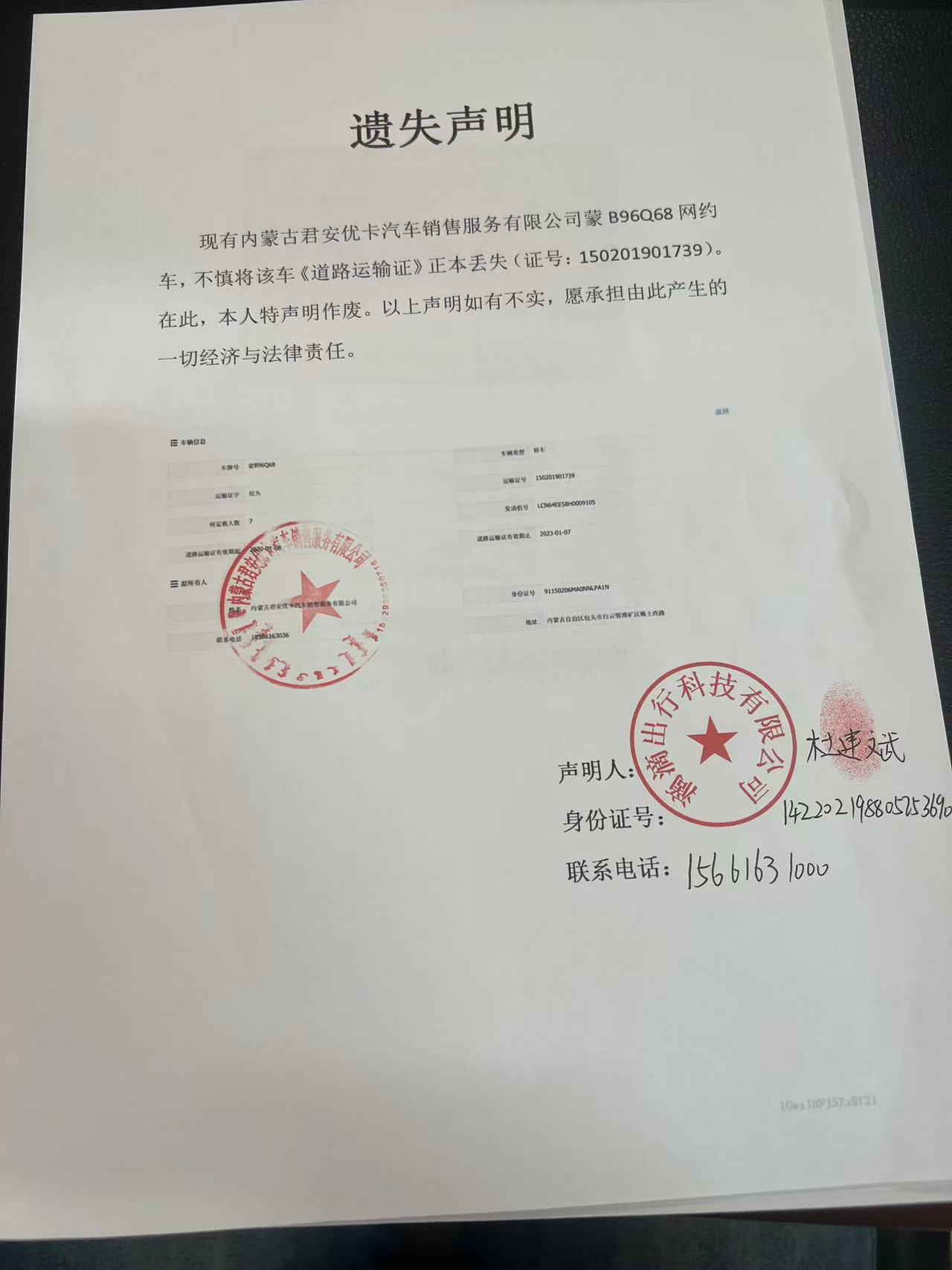 遗失声明(蒙B96Q68道路运输证丢失,声明作废)
