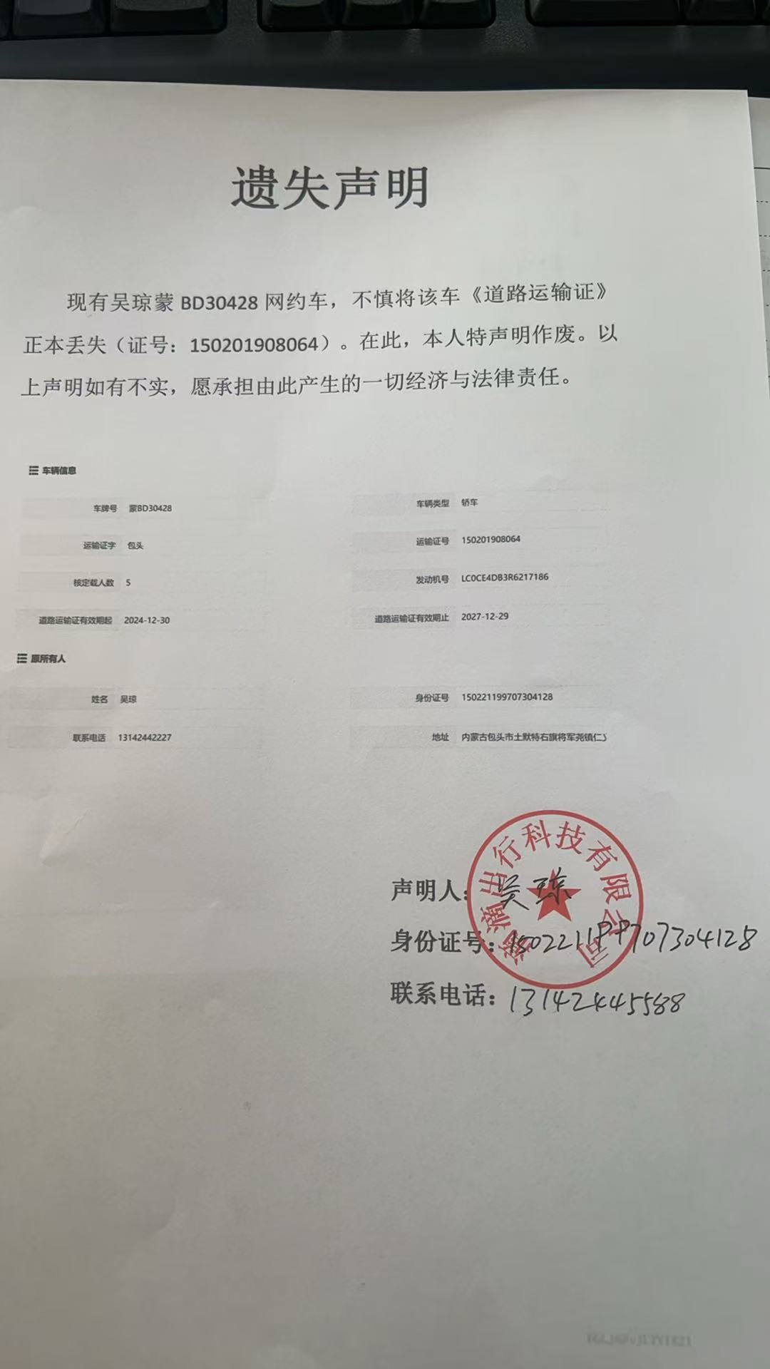 遗失声明(蒙BD30428道路运输证丢失,声明作废)