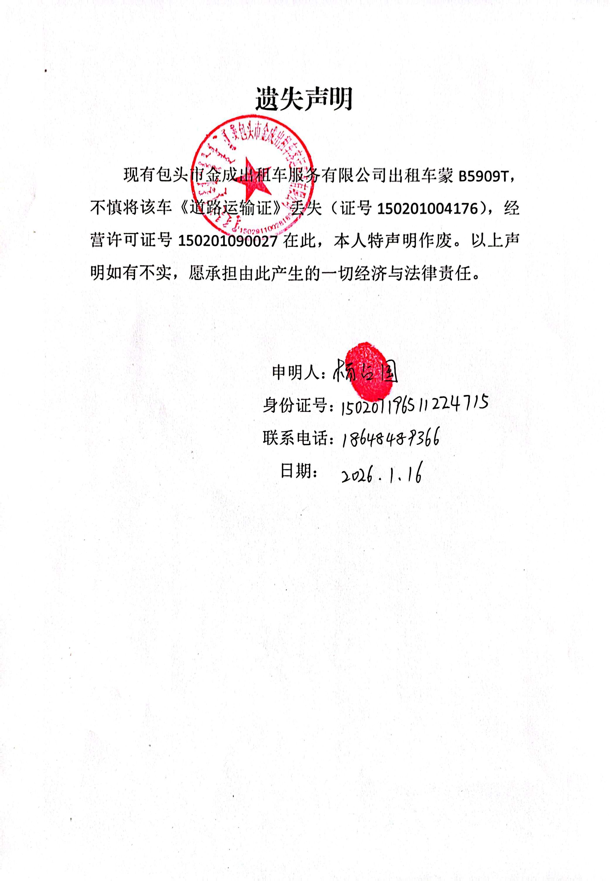 遗失声明(蒙B5909T道路运输证丢失,声明作废)