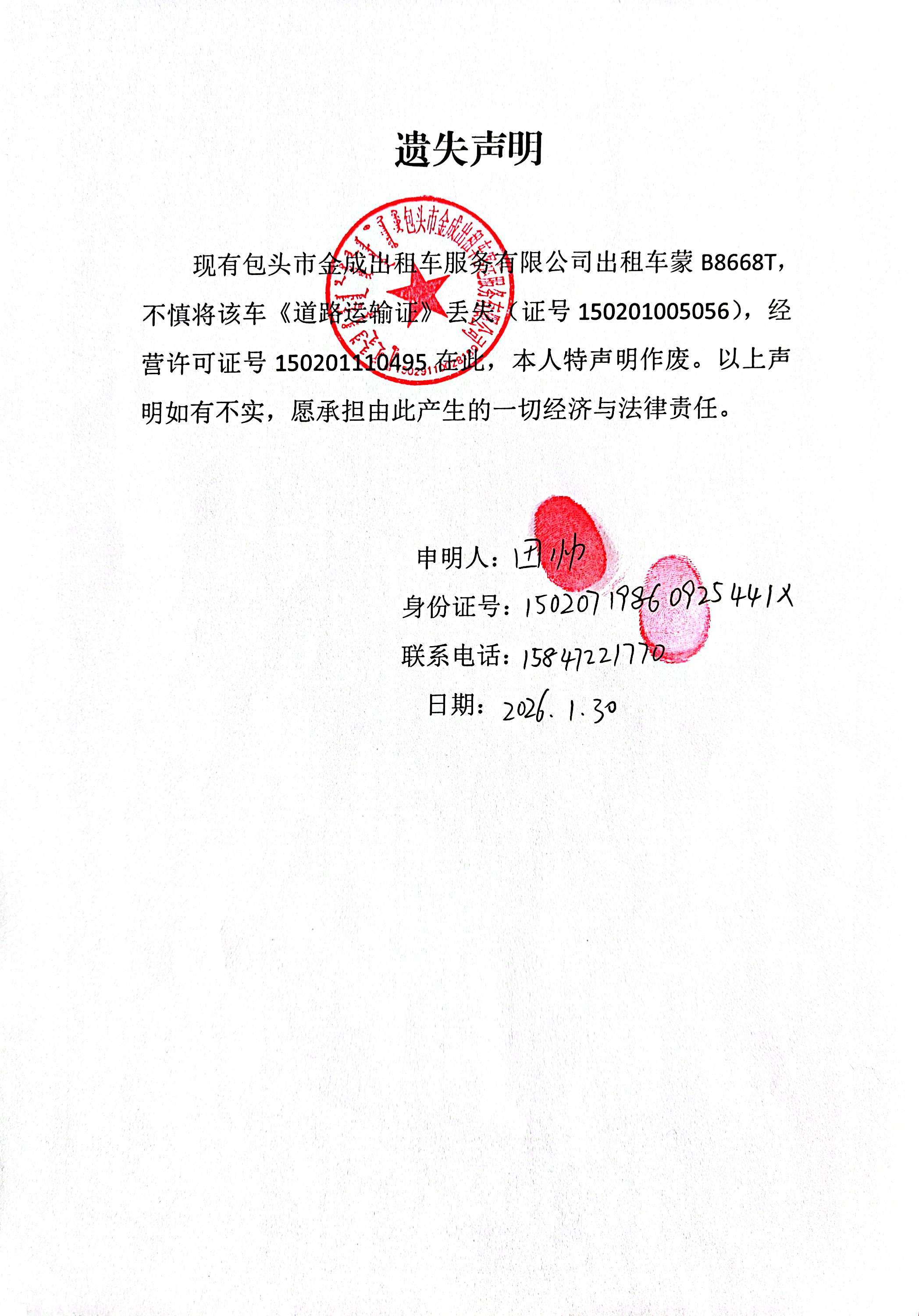 遗失声明(蒙B8668T道路运输证丢失,声明作废)