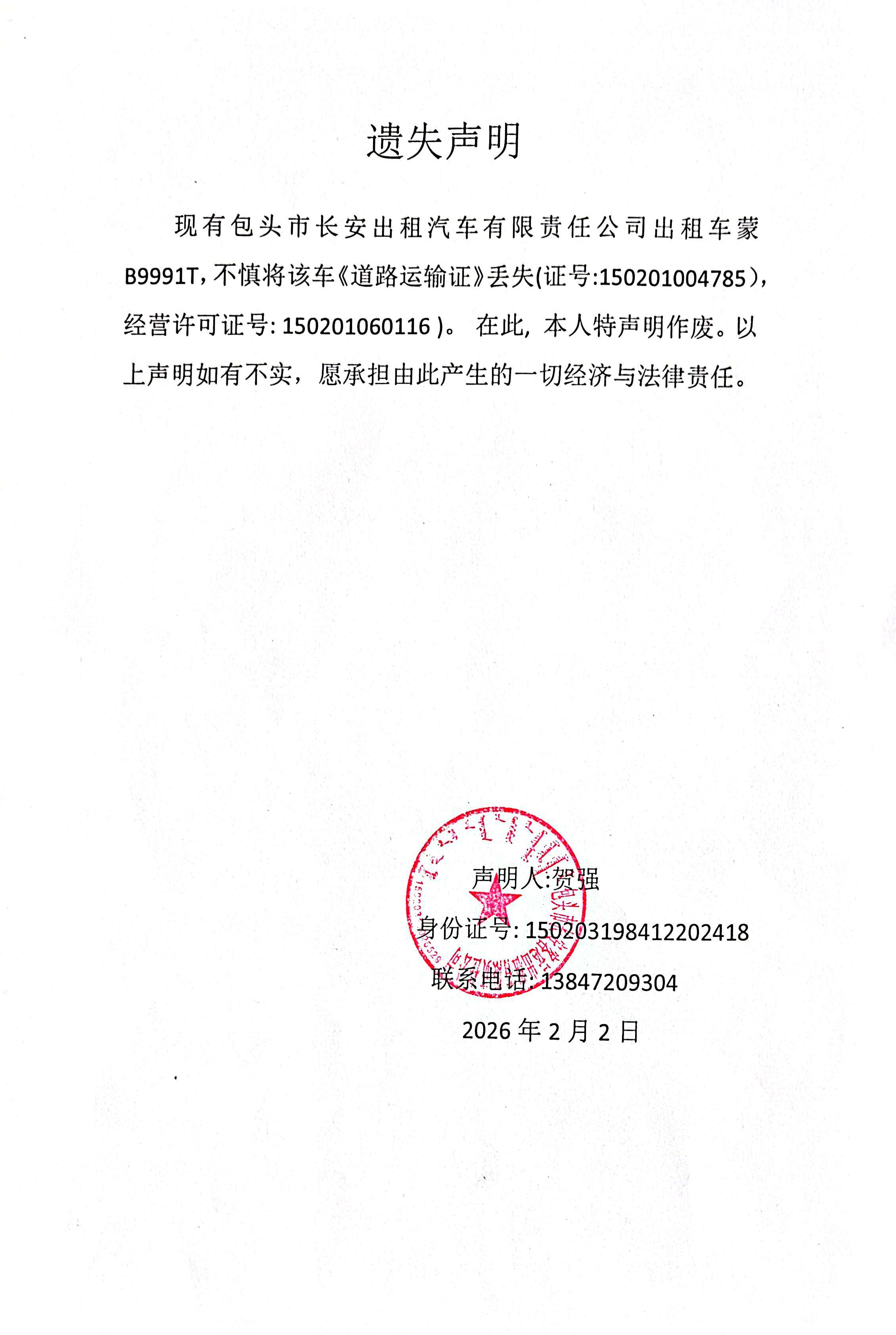 遗失声明(蒙B9991T道路运输证丢失,声明作废)