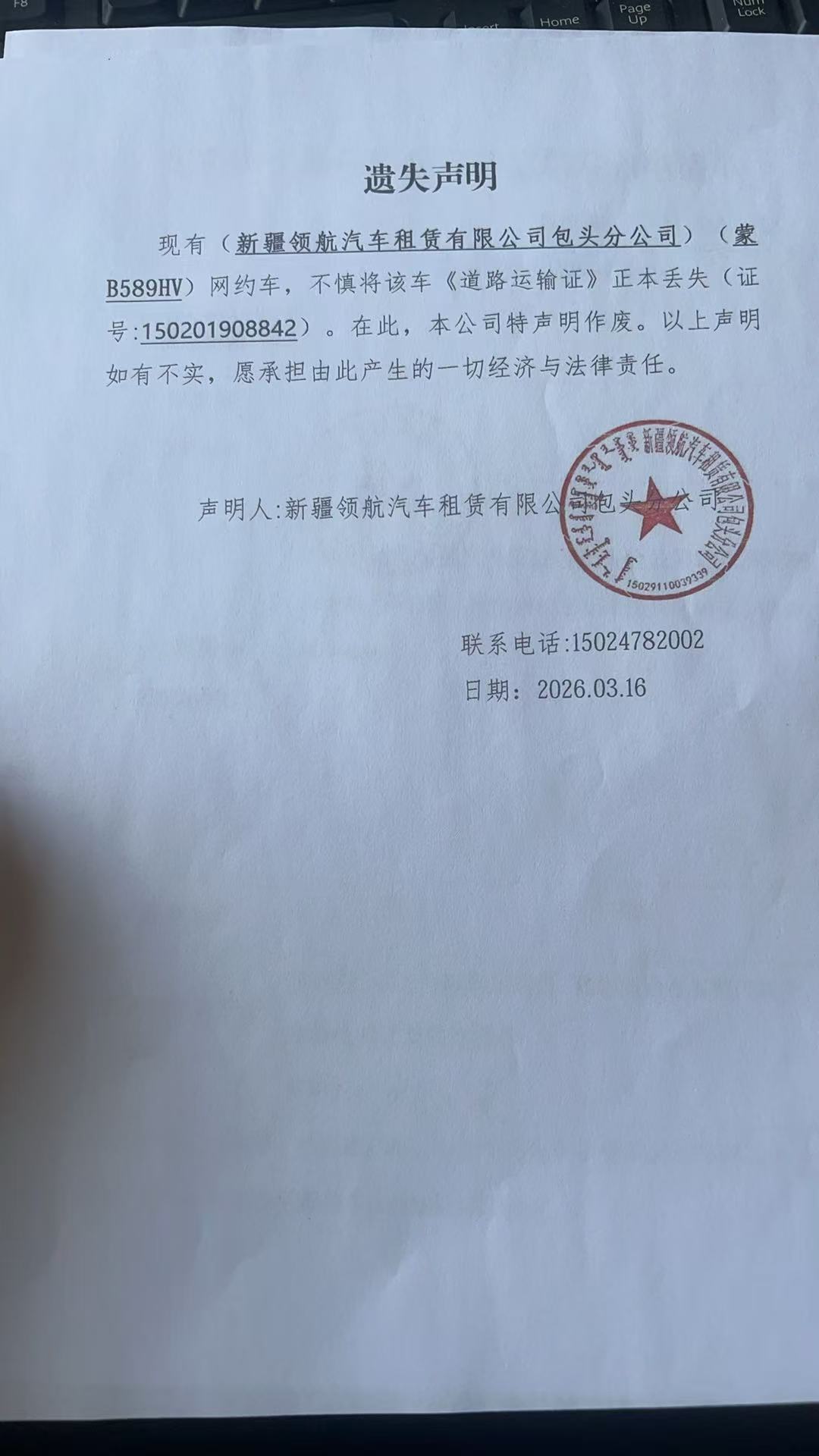 遗失声明(蒙B589HV道路运输证丢失,声明作废)